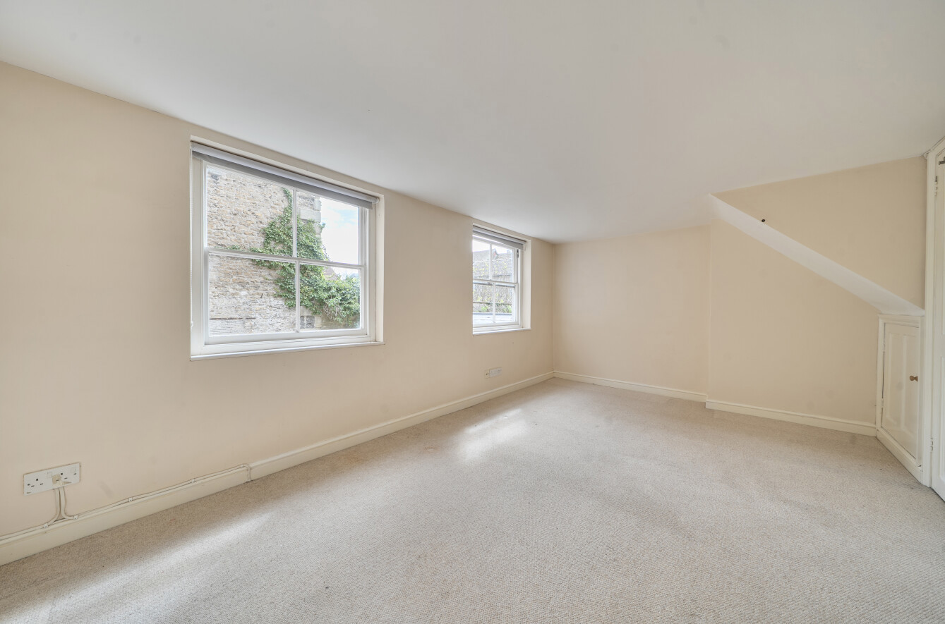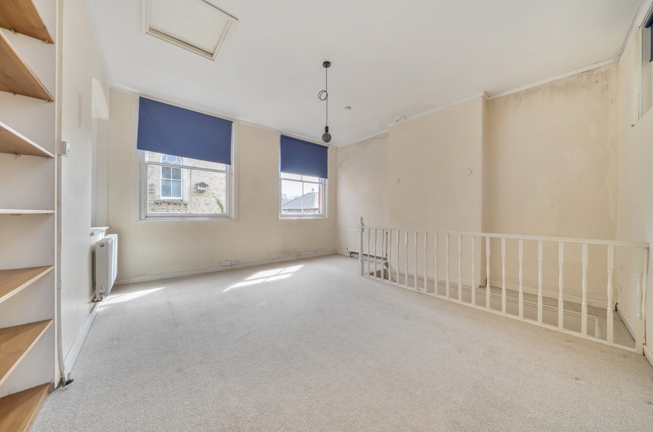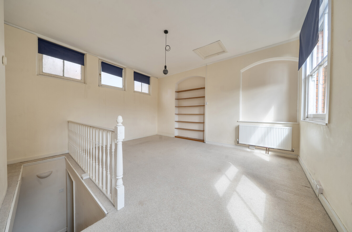 Bedroom 4/Studio Room: This exceptional room enjoys a southerly aspect with two large sash windows to the rear, two arched recesses (one is shelved) two radiators, high ceilings and three obscure glazed windows to the northern side.