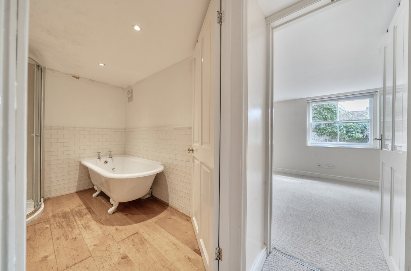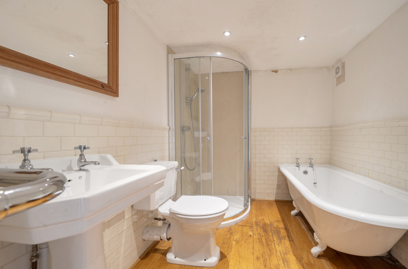 Family Bathroom: With a white suite comprising a roll top bath, corner entry shower enclosure with thermostatic shower, low level WC, pedestal wash basin and a deep finned towel rail/radiator.