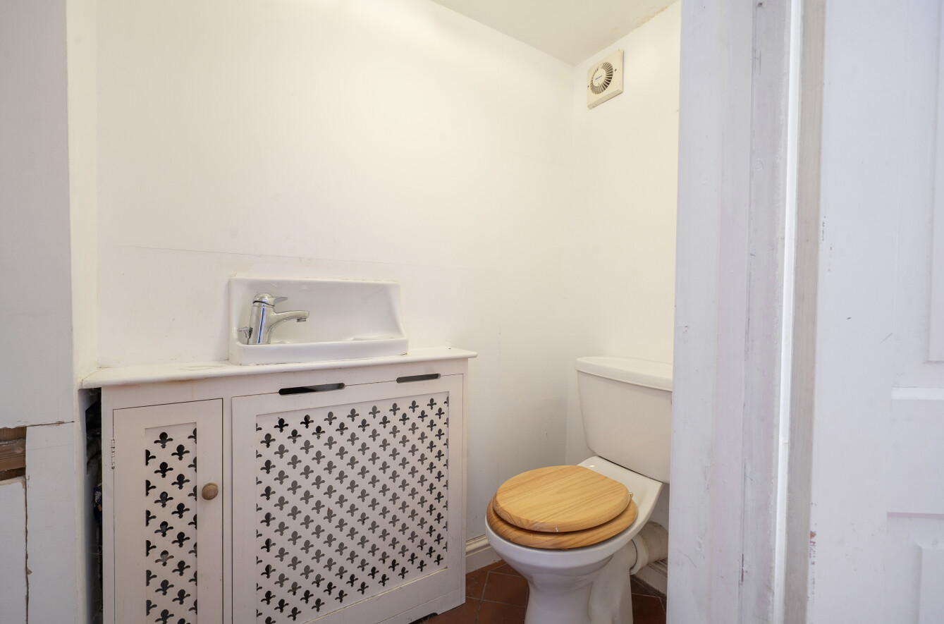 Cloakroom: With a white low level WC, wash basin and radiator within a radiator cover.